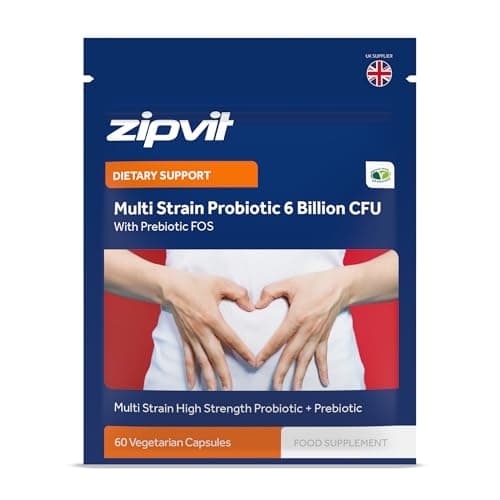 Zipvit Multi-Strain Probiotic capsules support gut health with five active probiotic strains and added prebiotic FOS. Vegetarian-friendly, gluten-free, eco-friendly packaging, and no refrigeration required.