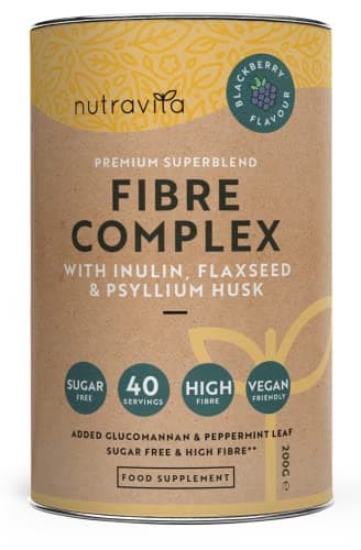 Nutravita’s Fibre Complex Powder offers 3g of soluble dietary fibre per 5g scoop. Made with inulin, flaxseed, and psyllium husk, it’s vegan and allergen-free. Each 200g tub provides 40 blackberry-flavoured servings.