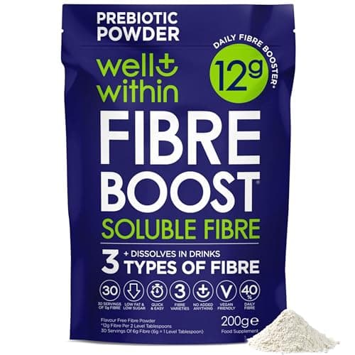 12g soluble fibre supplement containing inulin, FOS and acacia. Provides 6g dietary fibre per tablespoon. Supports gut health, vegan friendly, for adults and children. UK made, dissolves easily in drinks.