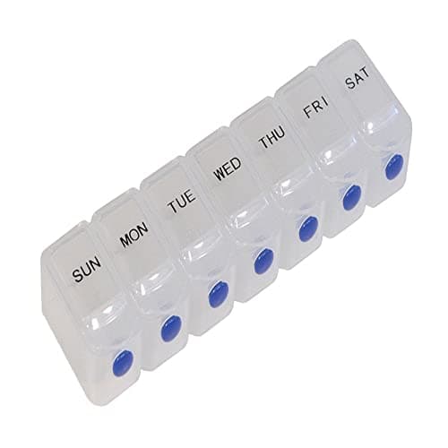 Personal pill dispensers ensure 7-day medication management. Each marked compartment measures 2.7cm x 16.8cm x 5.2cm. Ideal for those with numerous daily tablets. Easy push-button opens compartments.