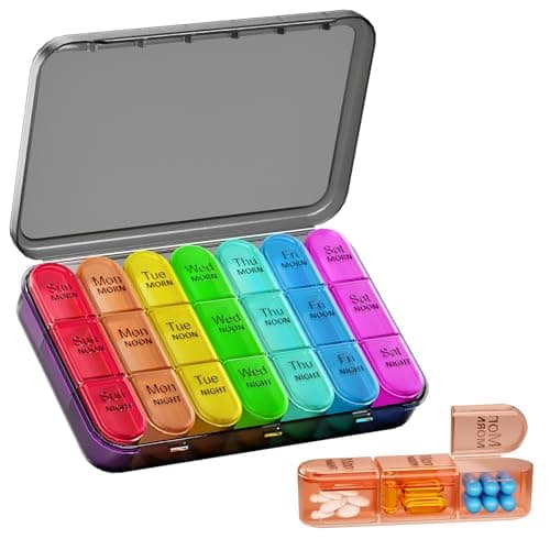 PokeLabel Personal Pill Dispensers 7-Day, 3-Times Daily Tracker keeps your tablets organised. Each BPA-Free compartment holds 8 fish oils and 16 capsules. Compact and easy to carry for travel or work use.