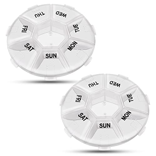 Personal Pill Dispensers: Each compartment separates different medicines for daily use. Weekday labels make it simple for elderly or children. Compact for travel. Clear design shows contents. Made of PP plastic.