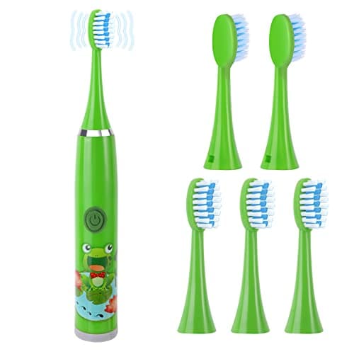 Pwsap Children's Electric Toothbrush ensures Baby and Child Dental Care with soft bristles, food-grade heads, and a non-slip handle. Frog designs make brushing fun for kids aged 3-12. 5 replacement heads included.