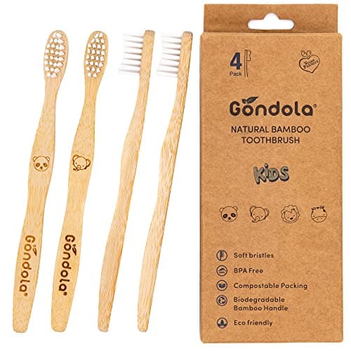 Gondola Kids Bamboo Toothbrushes are perfect for baby and child dental care. This 4-pack lasts a year, with ergonomic, water-resistant, splinter-free handles children can decorate. Eco-friendly packaging.